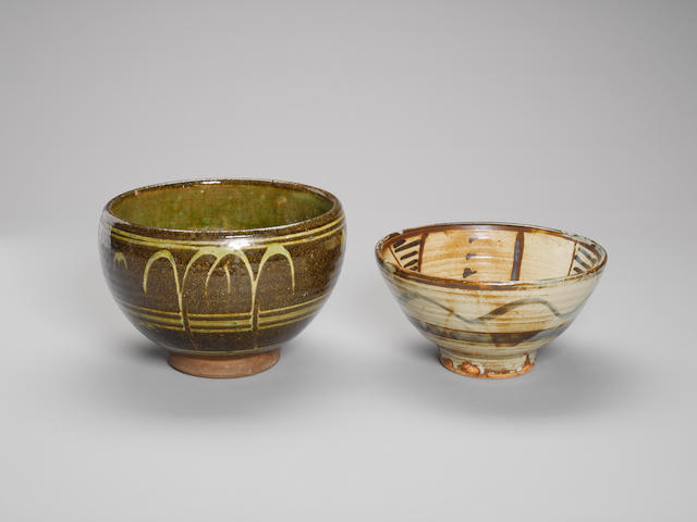 John's swishes, like fountains, are inspired by some of Michael Cardew's decoration. The left bowl is an example of what I mean: