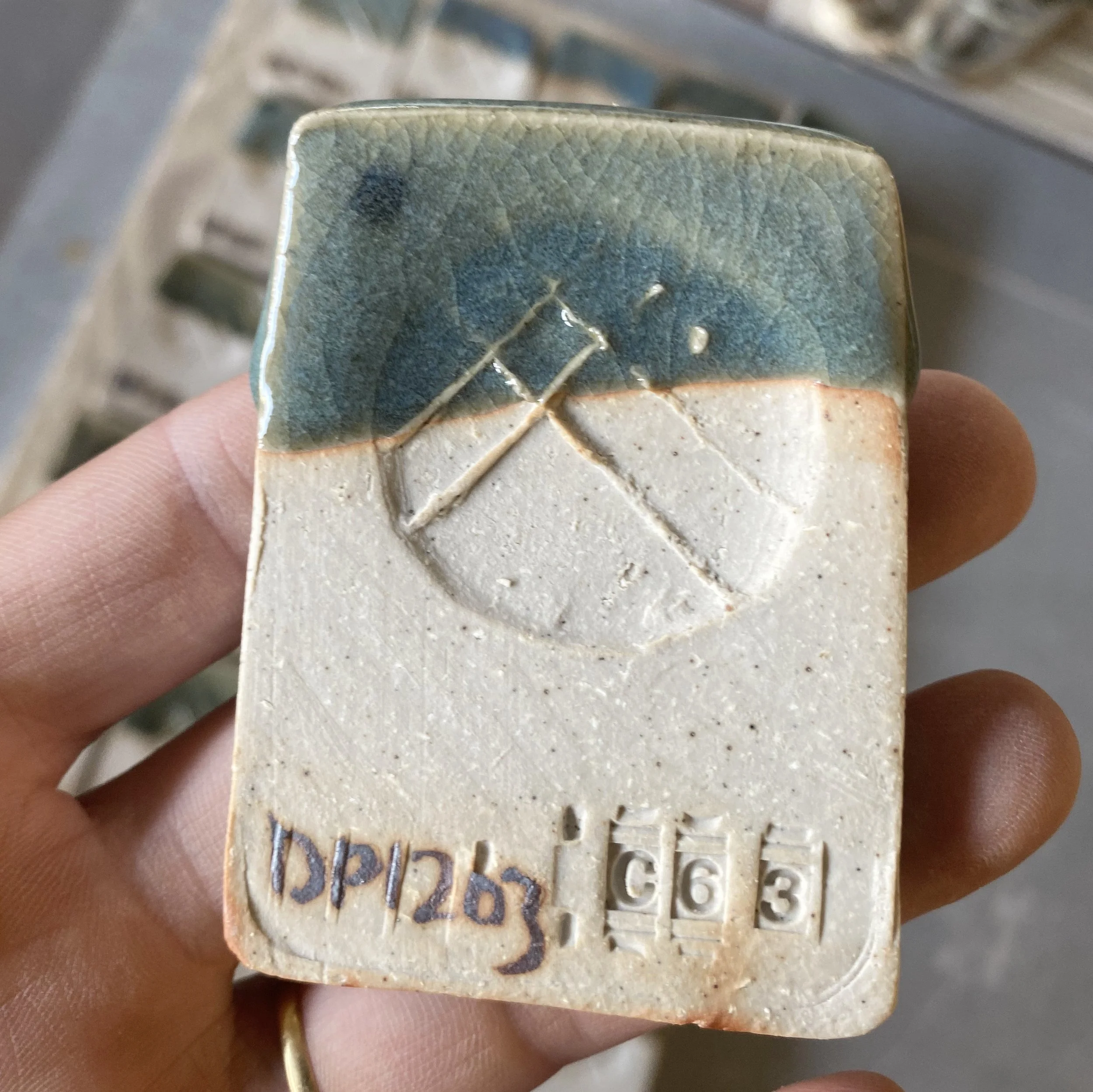 On the backside of each test tile I painted a strip of copper carbonate to see its response under the Jun glaze. It was exciting to see some of the colour responses.
